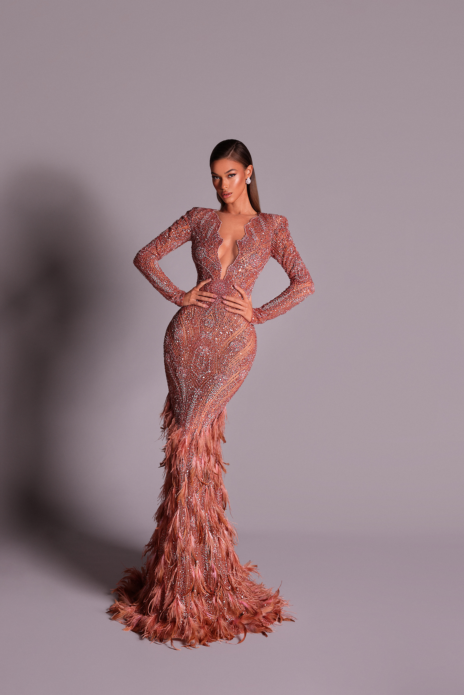 V-shape maxi dress with crystals and handmade stones sewing feathers in the bottom part. Perfect for special occasion.