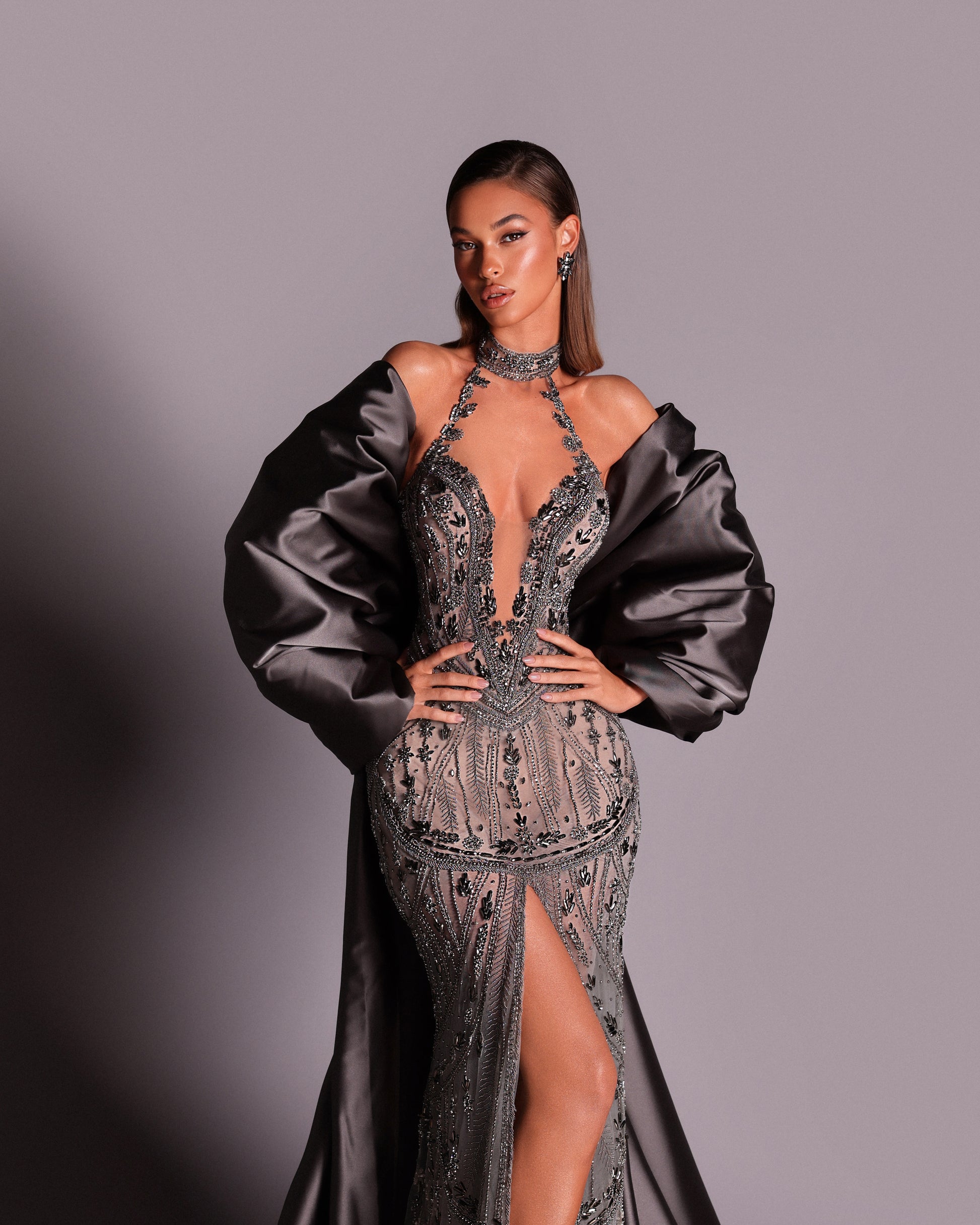 Make a statement with long grey dress with a big ribbon cape. Handmade stones for an ensemble look.